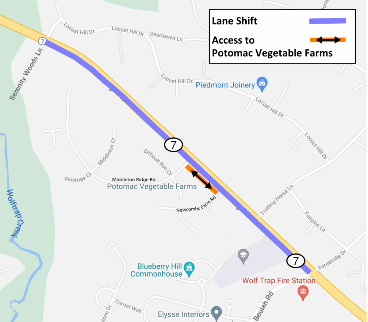 Drivers will access Newcombs Farm Road and Potomac Vegetable Farms via Middleton Ridge Road and a temporary service road until on or about Sept. 10 while crews build a new right-turn lane from eastbound Route 7 to Newcomb Farms Road.