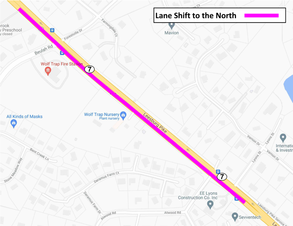 VIENNA - On or about Oct. 12, drivers on eastbound Route 7 will experience a lane shift to the north (towards the median) from west of Beulah Road to east of Atwood Road. All residences, businesses and other public facilities will remain accessible. Please see the map below for details.