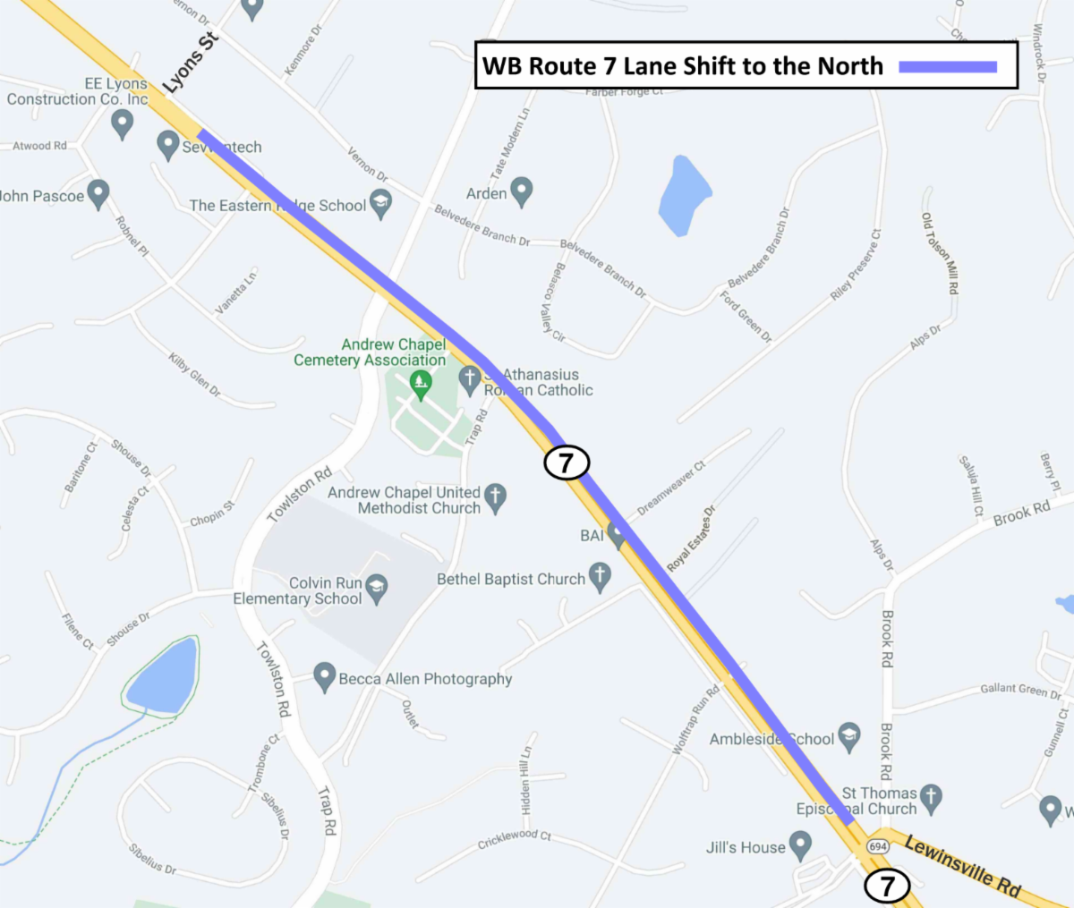 MCLEAN - On or about Dec. 16, drivers on westbound Route 7 will experience a lane shift to the north (away from the median) between Lewinsville Road and Lyons Street. All residences, businesses and other public facilities will remain accessible. Please see the map below for details.