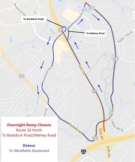 • The ramp from northbound Route 28 to Braddock Road/Walney Road will be closed from midnight to 4 a.m.