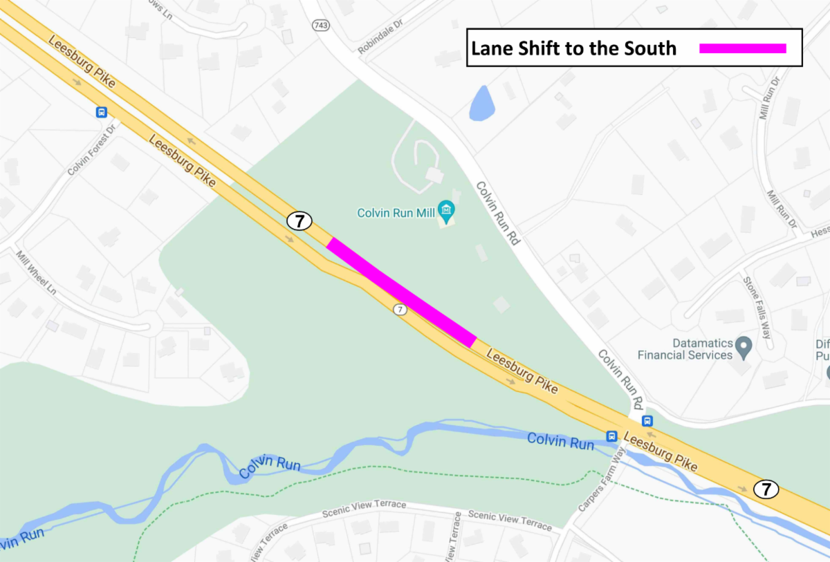 GREAT FALLS - Starting on or about Thursday, Feb. 3, drivers on westbound Route 7 will experience a lane shift to the south (towards the median) between Carpers Farm Way and Colvin Forest Drive as crews continue construction of the pedestrian underpass at Colvin Run Mill Park.
