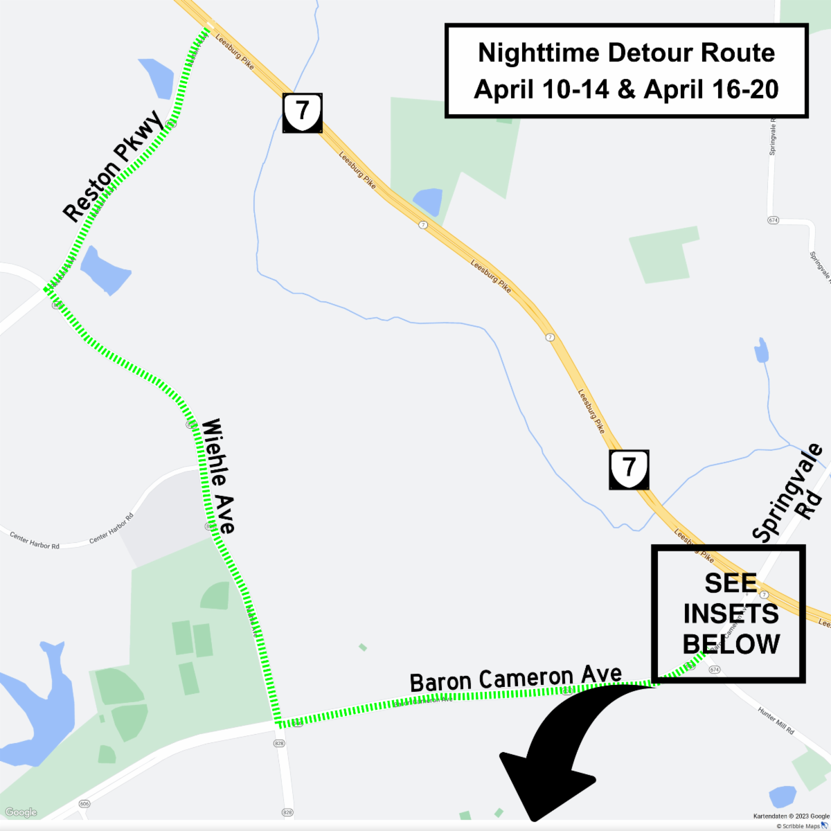 - Drivers on Springvale Road to Baron Cameron Avenue will turn right onto westbound Route 7 and follow the detour route to Reston Parkway and Wiehle Avenue to Baron Cameron Avenue.