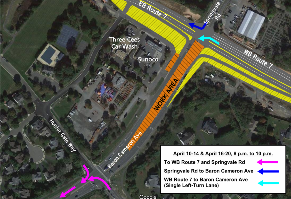RESTON - Starting on or about the evening of Monday, April 10, crews will begin reconstructing the Route 7/Baron Cameron Avenue intersection. Weather permitting, the work is scheduled to take place on the nights of April 10-14 and April 16-20 between 8 p.m. and 5 a.m. The following modified traffic patterns will be in place in the work area: