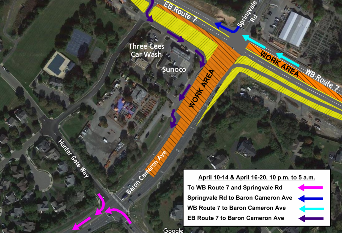 - The triple left-turn lanes from westbound Route 7 to Baron Cameron Avenue will be closed.